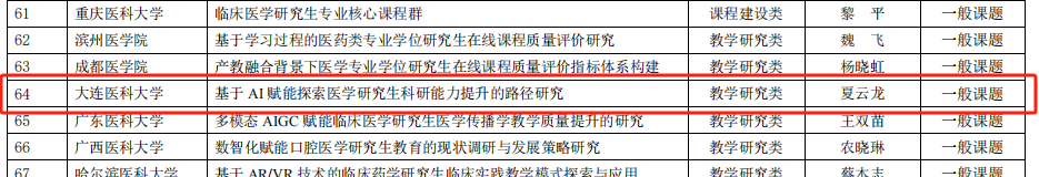 夏云龙教授牵头的《基于AI赋能探索医学研究生科研能力提升的路径研究》获教学研究类课题立项,李华教授牵头的《AI背景下依托中西医结合学科加强医学技术在线课程群建设》获课程建设类重点课题立项。